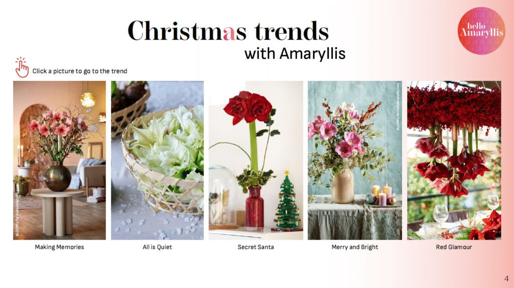 Tijdens het kerstseizoen is de Amaryllis dé favoriet in de bloemist: het aanbod is rijk, de kleurschakeringen eindeloos en de impact ijzersterk. Om jouw creativiteit te prikkelen lichten we hieronder kort de vijf trends met Amaryllis uit. Download de PDF en ga meteen zelf aan de slag!